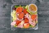 Lettuce, tomatoes, cucumbers, Kalamata olives, green pepper, ham, salami, Genoa salami, pepperoni, provolone cheese. Dressing of your choice.